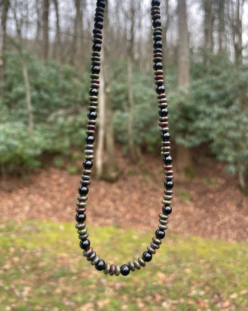 Dragonblood Jasper is known for its grounding, strengthening energy. Its deep green and red tones are associated with courage, resilience, and motivation. Many people wear it to support focus, determination, and a steady mindset during challenges.